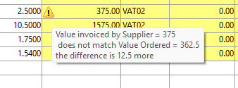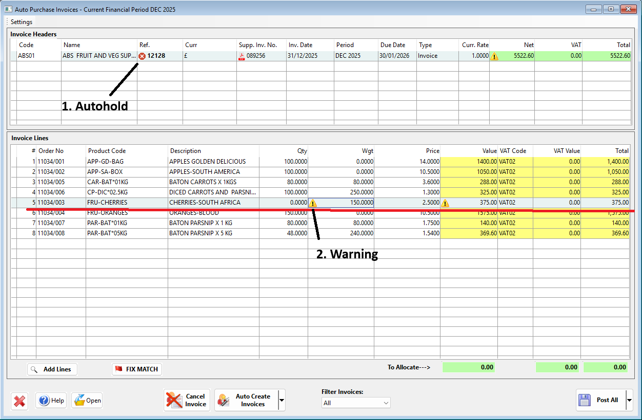 Your invoice will appear now in the auto purchase grid. Working with the above example an invoice has arrived from ABS Fruit, the system will pick up some key information and fill this in on season i.e. supplier invoice number, invoice date , net and total invoice value (There will be a set up guide below). With this invoice the system has flagged it to say there is a problem, what will happen in the case is we will put an auto hold on it which is highlighted above in Point 1. In Point 2. you will see a warning on the product line that is causing a problem and if you place your mouse on it, it will tell you that there is a difference with what is on the invoice compare to the original purchase order.