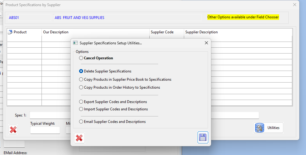 What you will want to set up in season is supplier specs , this will help us to match invoices to orders in season. Within the product spec box for suppliers we now have a utilities button, this will allow you to create a supplier spec based on either your price book or order history. This will fill in blank and you can then export out to excel to fill in yourself or you can email out to your supplier to fill in