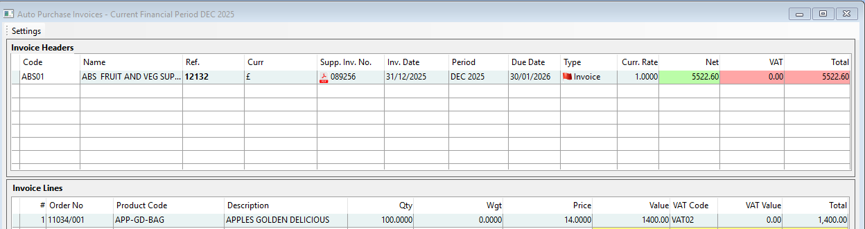 The final scenario will be you have an invoice from a supplier that product lines do not match what is on your season PO, this might be because you have 2 products in season but the supplier has combined the products into 1 line. What we will do here is we will import the invoice header and ignore the product lines on the invoice and we will just use the order lines on Season. At this stage you will need to go through and change the prices manually depending on what needs changed.