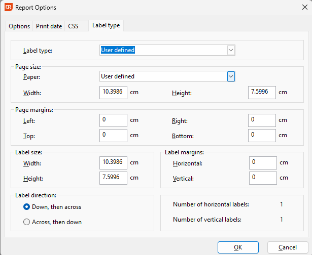 To change the size and orientation if you click on reports at the top of your screen > Report options > Label Type you will be able to view the default size